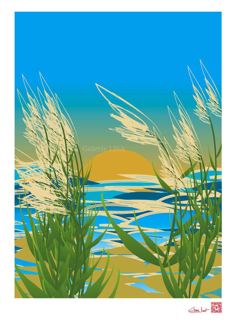Ses illustrations traduisent des lieux paisibles qui l’ont touchée dont elle ne garde que les éléments de la nature. Elle accentue les couleurs et minimalise les formes sur sa palette graphique à partir de croquis et photos. Le fil conducteur sur cette série de 12 oeuvres, est le soleil de la méditerranée qui permet de révéler les couleurs par la lumière et aussi le symbole du Japon !