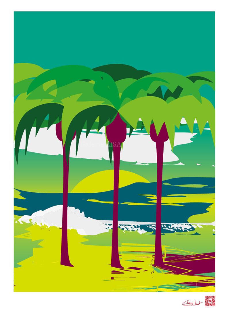 Ses illustrations traduisent des lieux paisibles qui l’ont touchée dont elle ne garde que les éléments de la nature. Elle accentue les couleurs et minimalise les formes sur sa palette graphique à partir de croquis et photos. Le fil conducteur sur cette série de 12 oeuvres, est le soleil de la méditerranée qui permet de révéler les couleurs par la lumière et aussi le symbole du Japon !